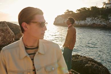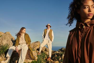 The Men’s collection revels in subverting expectations – proving that functionality can be playful with a hybrid technical jacket that can be worn multiple ways and comes with a detachable oversized pocket that doubles up as a bag. Unique prints that capture this essence of adventure are key. The hand-drawn airplane design is a signature for the season, sometimes depicted solo, or elsewhere with mini islands, palm trees and flocking birds. The oceans are also referenced in wave-and-shell jacquards and placed prints that reflect the view from above. Highlights include the bomber jacket and button-up wool-blend cardigan in rich hues of sage, seafoam and pink.