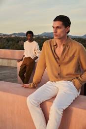 The Scotch & Soda Fall Women’s wear includes pops of bright orange evoke the sunsets of endless horizons, while muted tones of sand and driftwood nod to island life. The unique airplane prints playfully captures the essence of adventure. Sometimes, it’s used all over, like the crisp organic cotton shirt and belted wrap skirt. Other times, it’s subtly placed in a floral tile print, such as the Aline dress and reversible bomber jacket. Shifting from sky to sea, an abstract digital wave print animates a flowy shirt and wide-leg trousers. Utility wear remains key and is explored throughout with signature attention to detail.